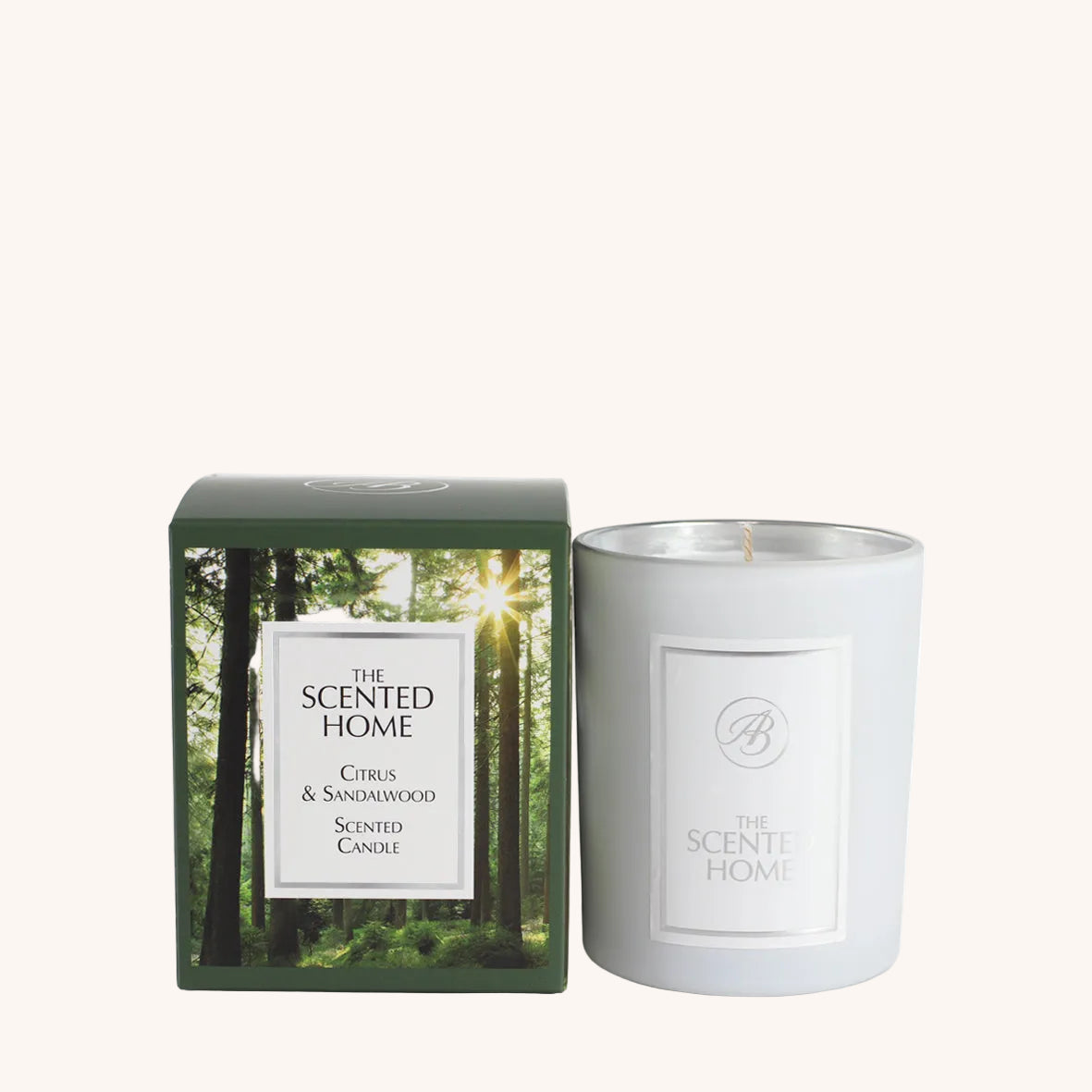 Our Citrus & Sandalwood Scented Candle features deep, invigorating base notes of mahogany and white cedarwood, accented by a warm core of spicy nutmeg and cinnamon and finished with a zingy bergamot top note.