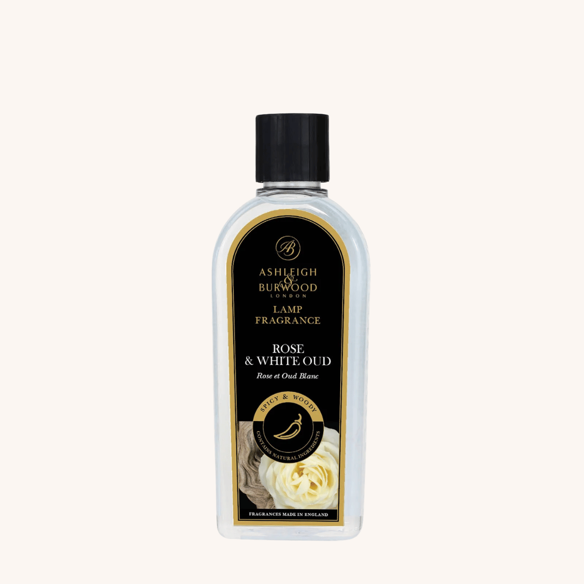 Our Rose & White Oud Lamp Fragrance features oud rising from the heart, harmonising with hints of blondewood, white amber and leather, beneath a simple rose top note.