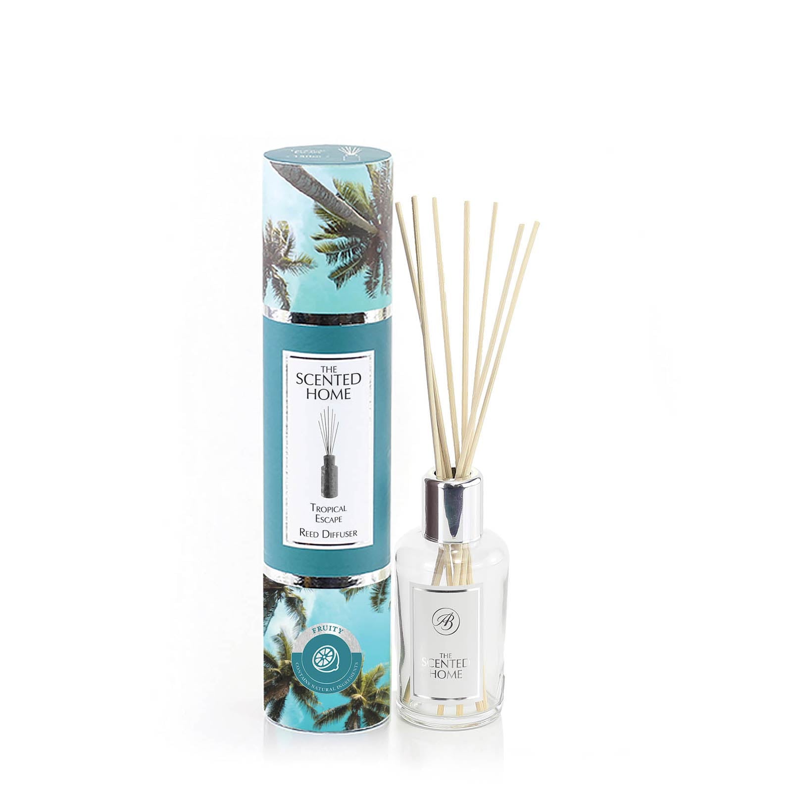 Our Tropical Escape Reed Diffuser features the scent of coconut flowers blossoming amid a tropical accord of white melon, zesty mojito and sweet musk.