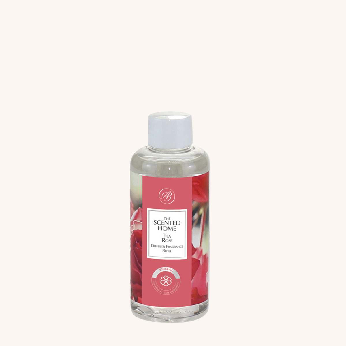 Tea Rose Reed Diffuser Refill features plump, velvety roses in full, rambling bloom amongst a decadent bouquet of lily, narcissus and dewy geranium petals.